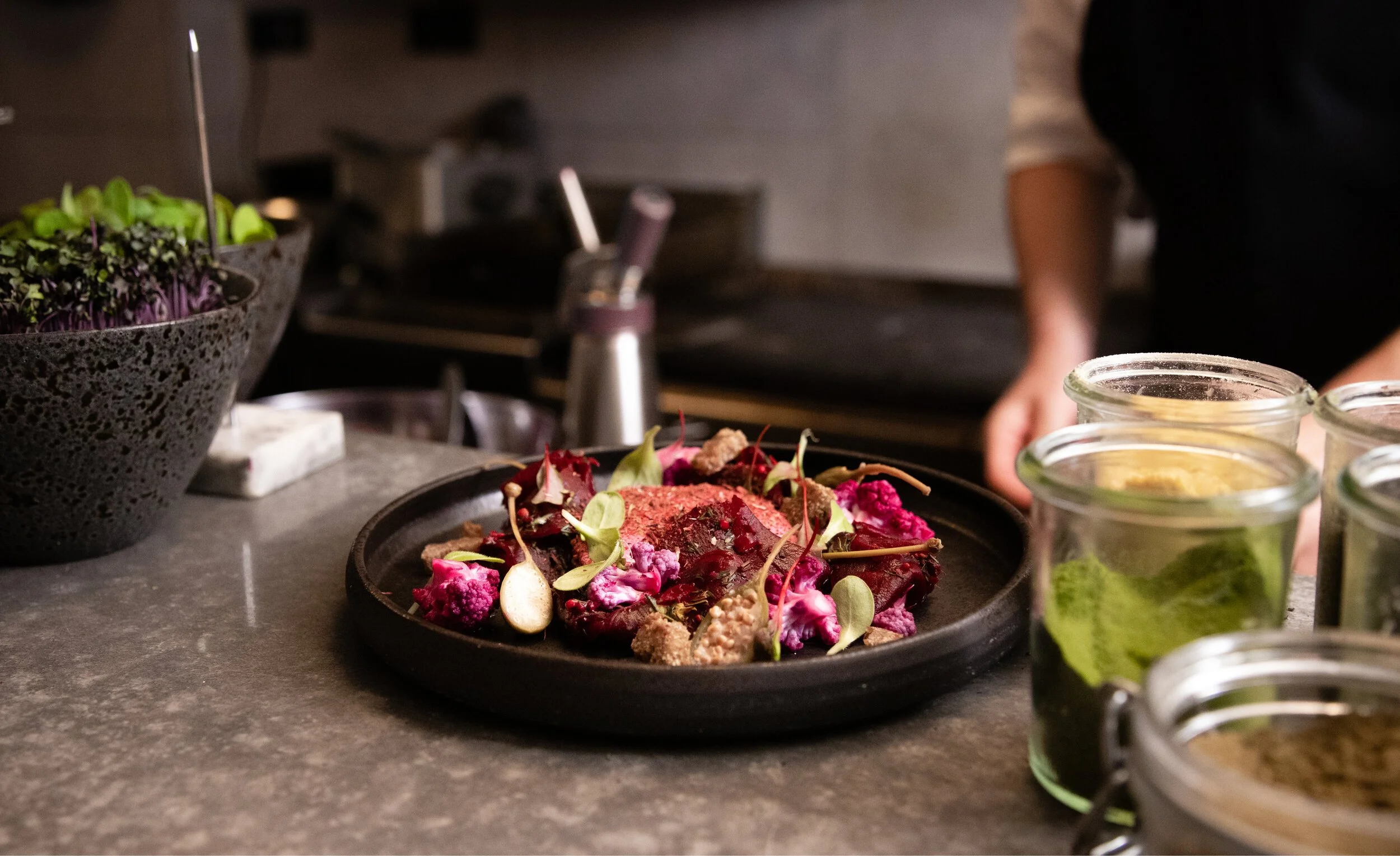 En YERBAxàbia, abrazamos una filosofía plant-forward, ofreciendo platos que celebran influencias globales. Desde la riqueza del ajo negro y la profundidad umami del miso, hasta el aromático za’atar y el ahumado pimentón, cada plato está preparado con técnicas innovadoras. Los amantes de la carne también disfrutarán de opciones como rabo de toro, codorniz y tartar de carne, asegurando que haya algo para todos los gustos.